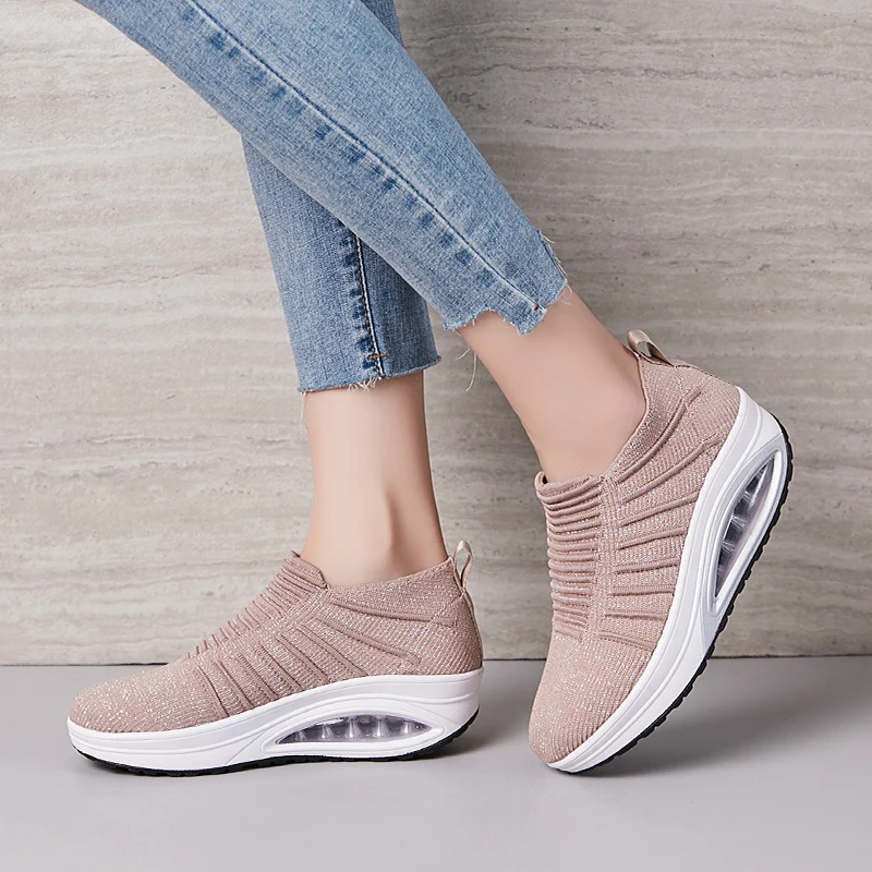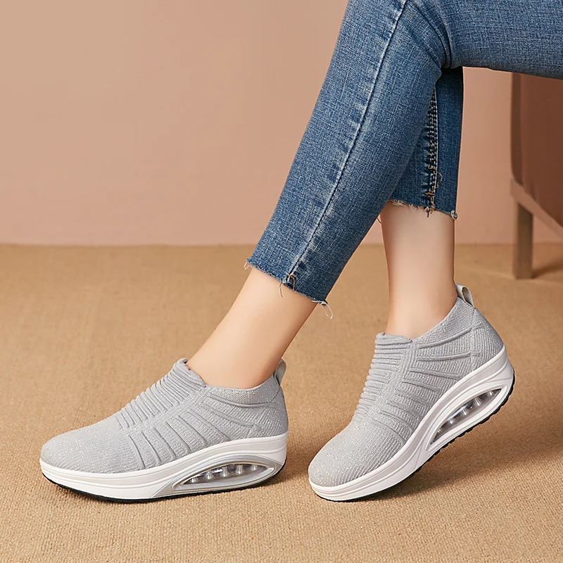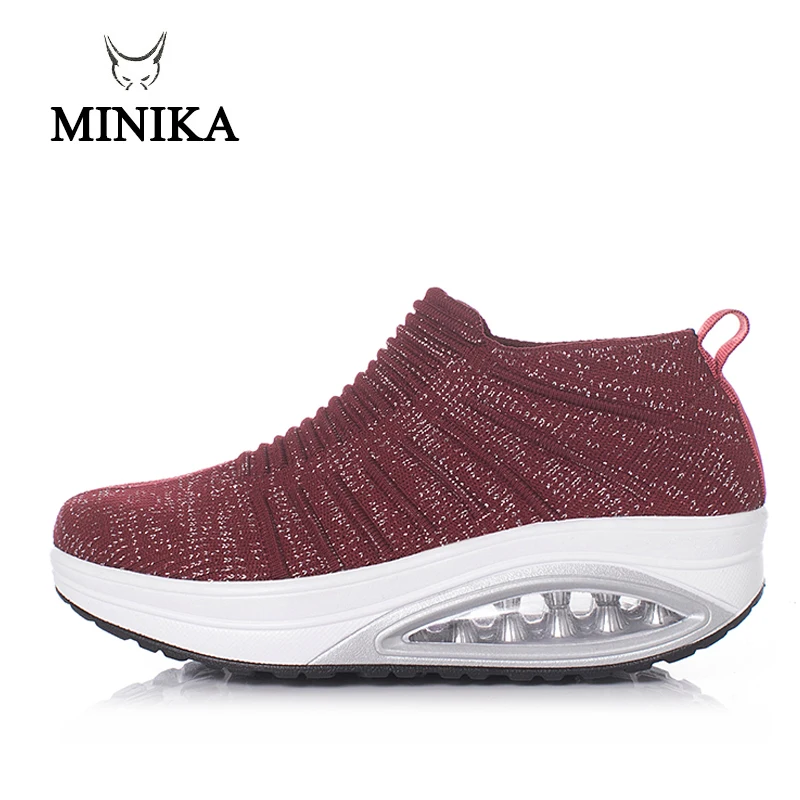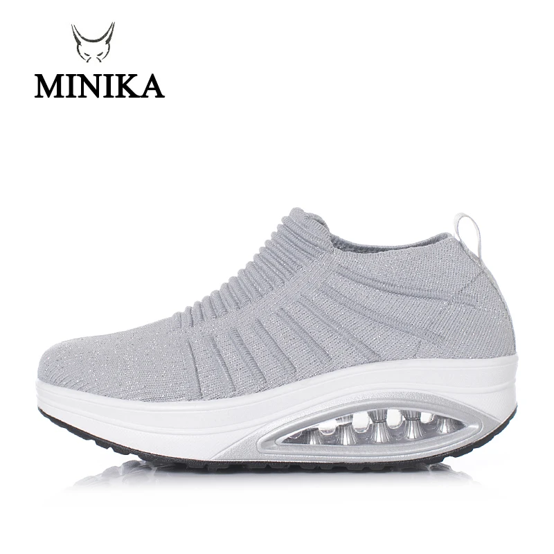 Minika Women Slimming Shoes Fly Wire Air Slip-on Sneakers 2019 New Wedge Height Increasing Female Toning Swing Shoes
