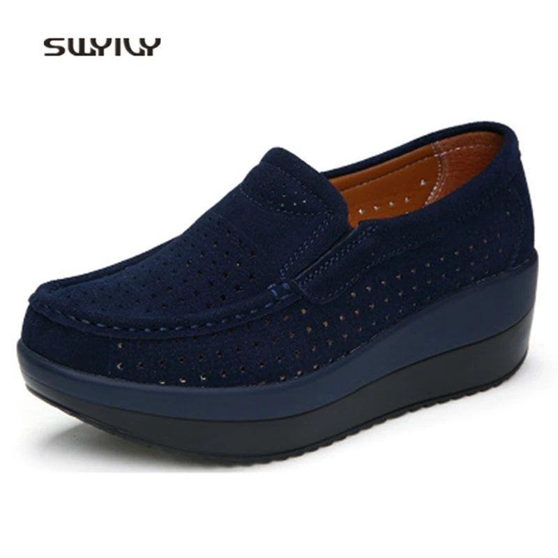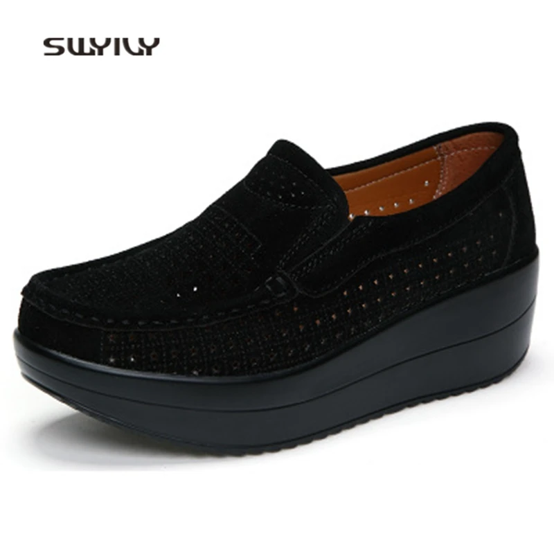 SWYIVY Women Toning Shoes Genuine Leather Thick-sole Breathable Swing Shoes 2018 Summer Hollow Big Size 42 Female Slimming Shoes