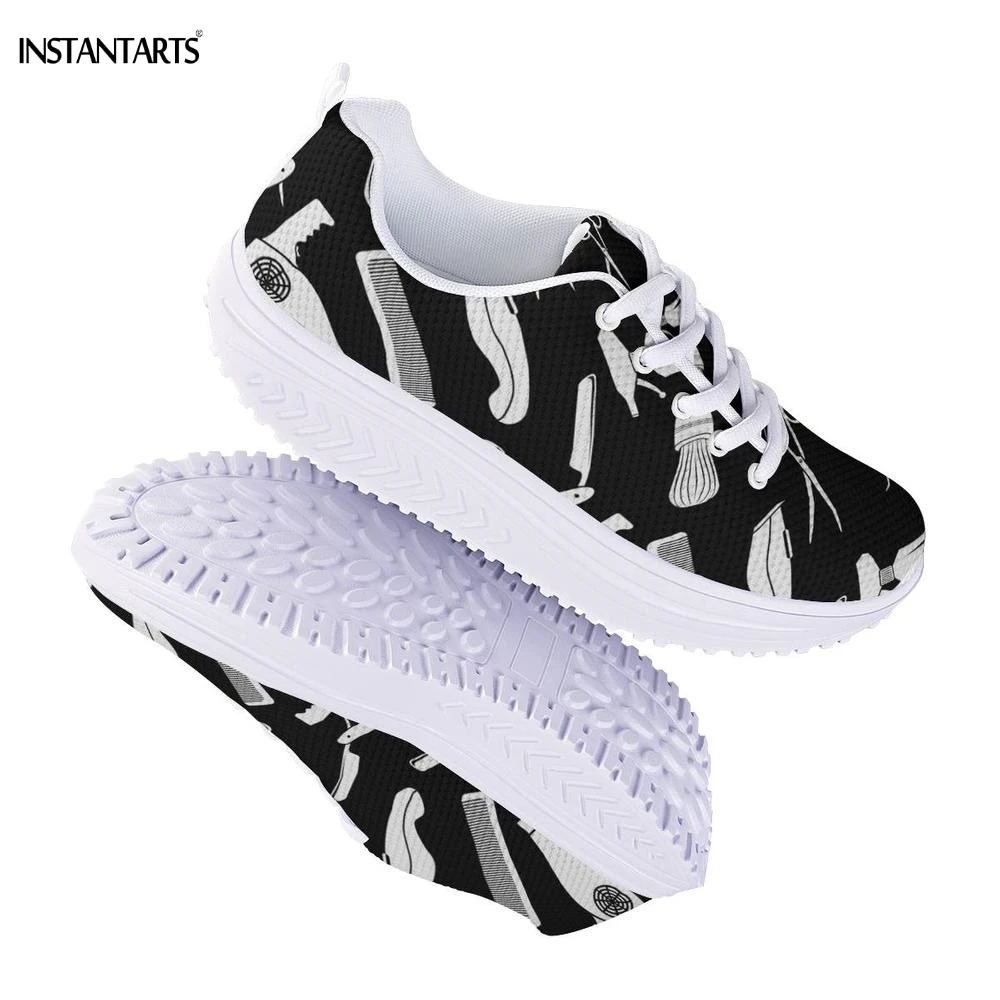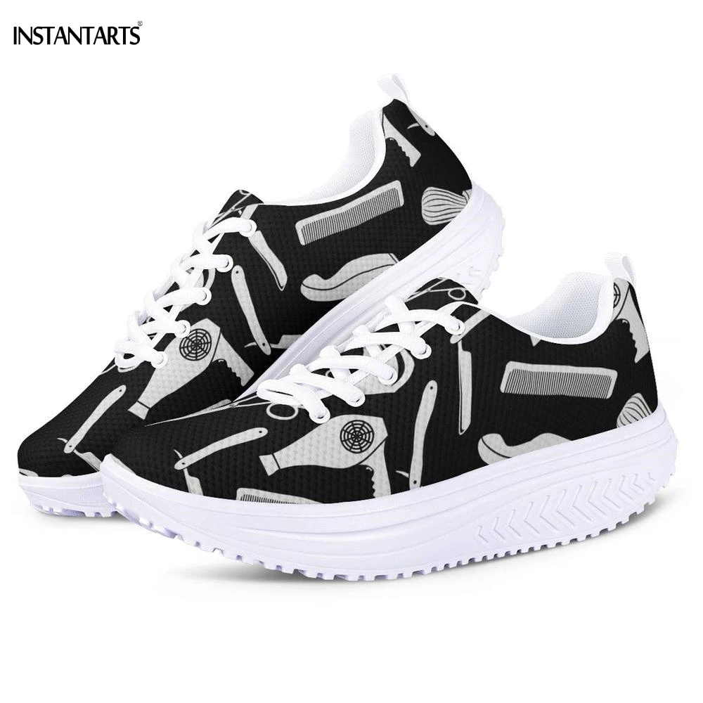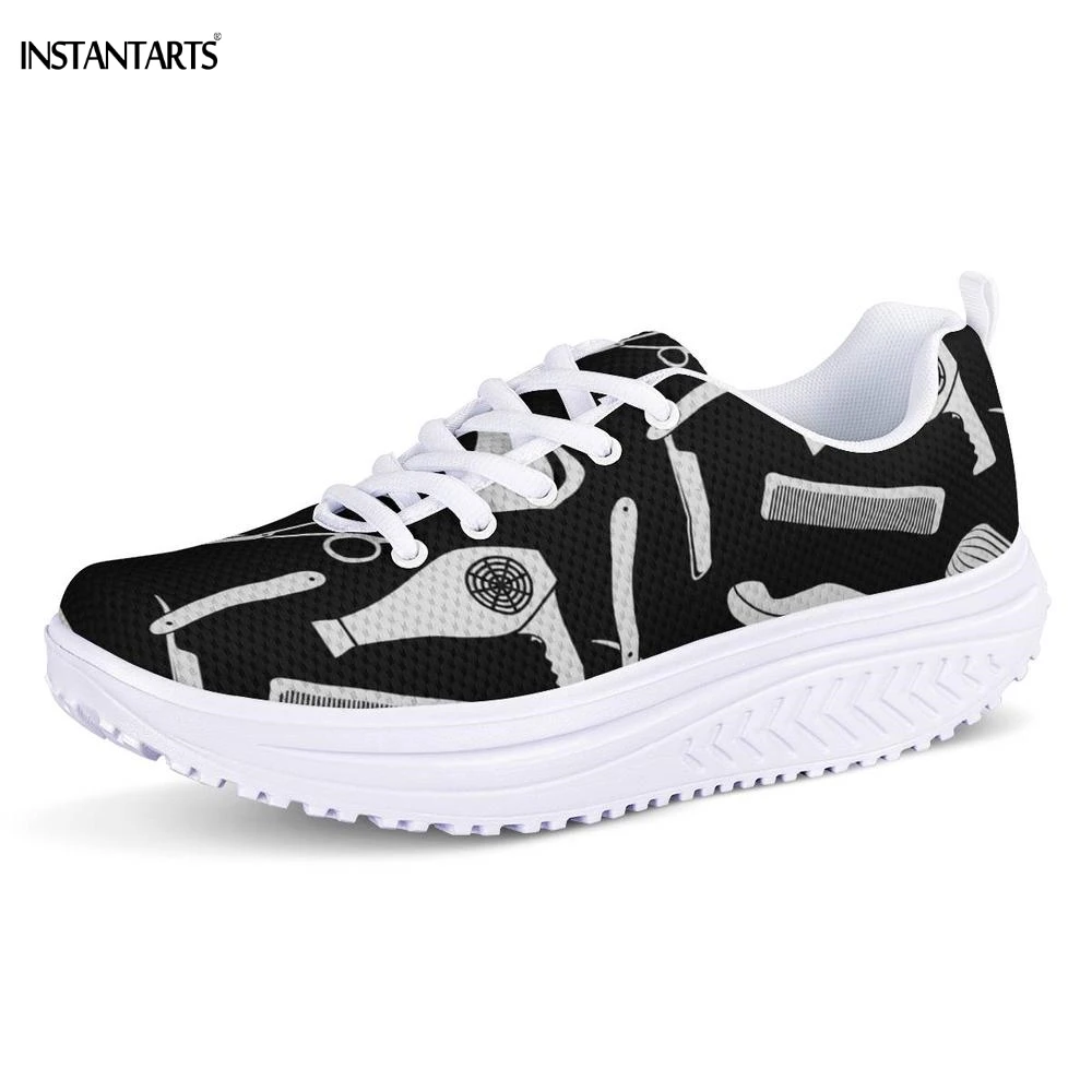 INSTANTARTS 3D Barber/Hair Stylist Pattern Women Black Swing Shoes Outdoor Female Fitness Shaping Shoes Platform Wedge Sneakers