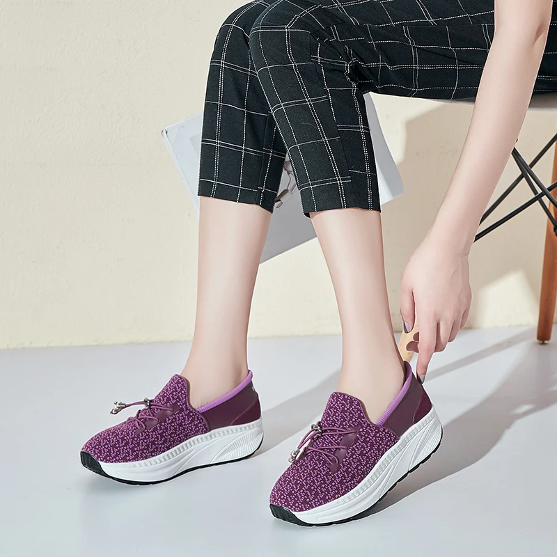 Spring Women Wedge Sneaker Slimming Toning Shoes Minika Thick Bottom Drawstring Women Fitness Shoes Slip On Walking Shoes Purple