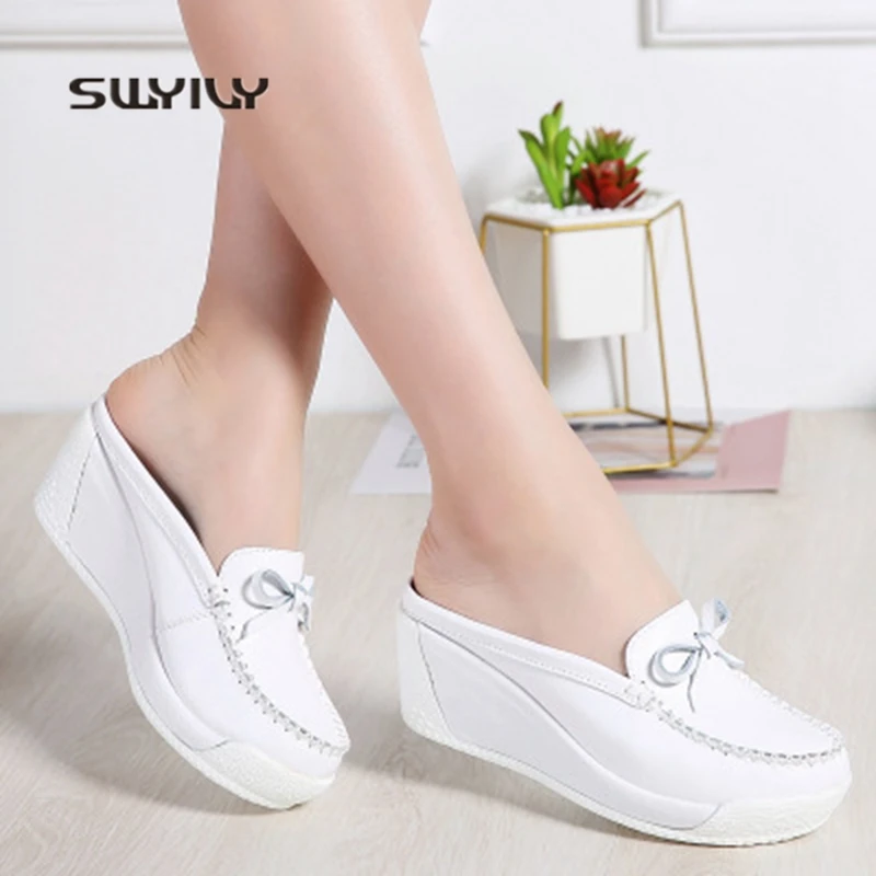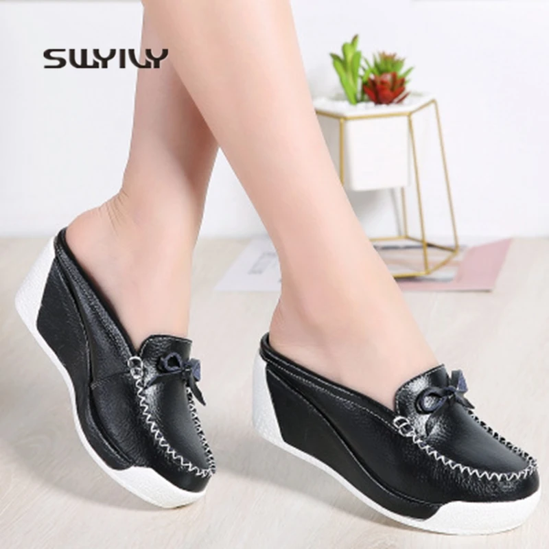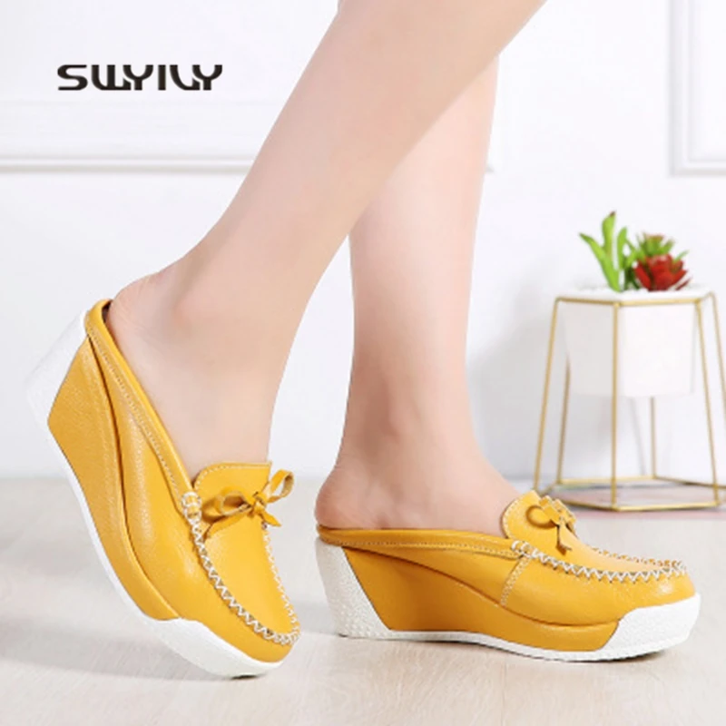 SWYIVY Women Toning Shoes Platform Genuine Leather 2018 New Summer Bow-knot Height Increasing Muffin Heel Female Swing Slipper