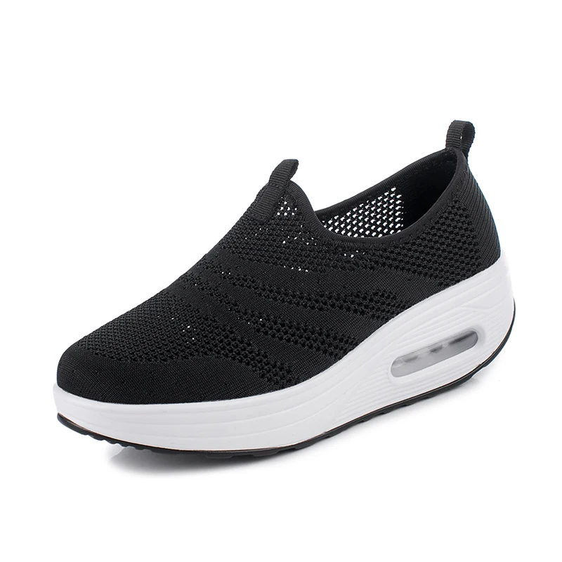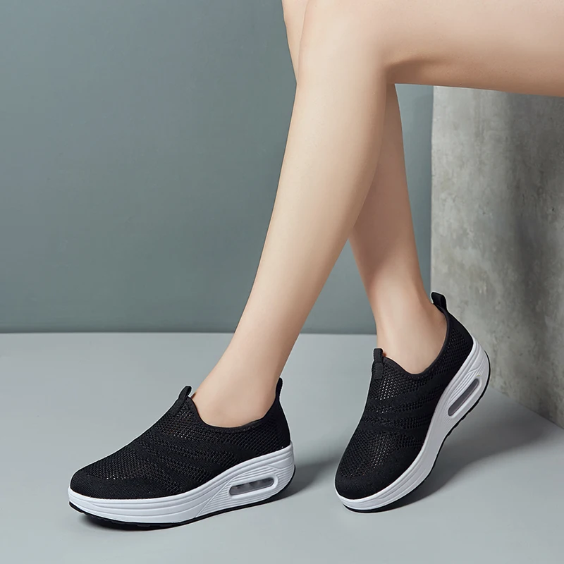 Spring Autumn Women Shoes Air Cushion Breathable Mesh Rocking Shoes Soft Slip On Wedge Platform Sneakers Heighten Slimming Shoes